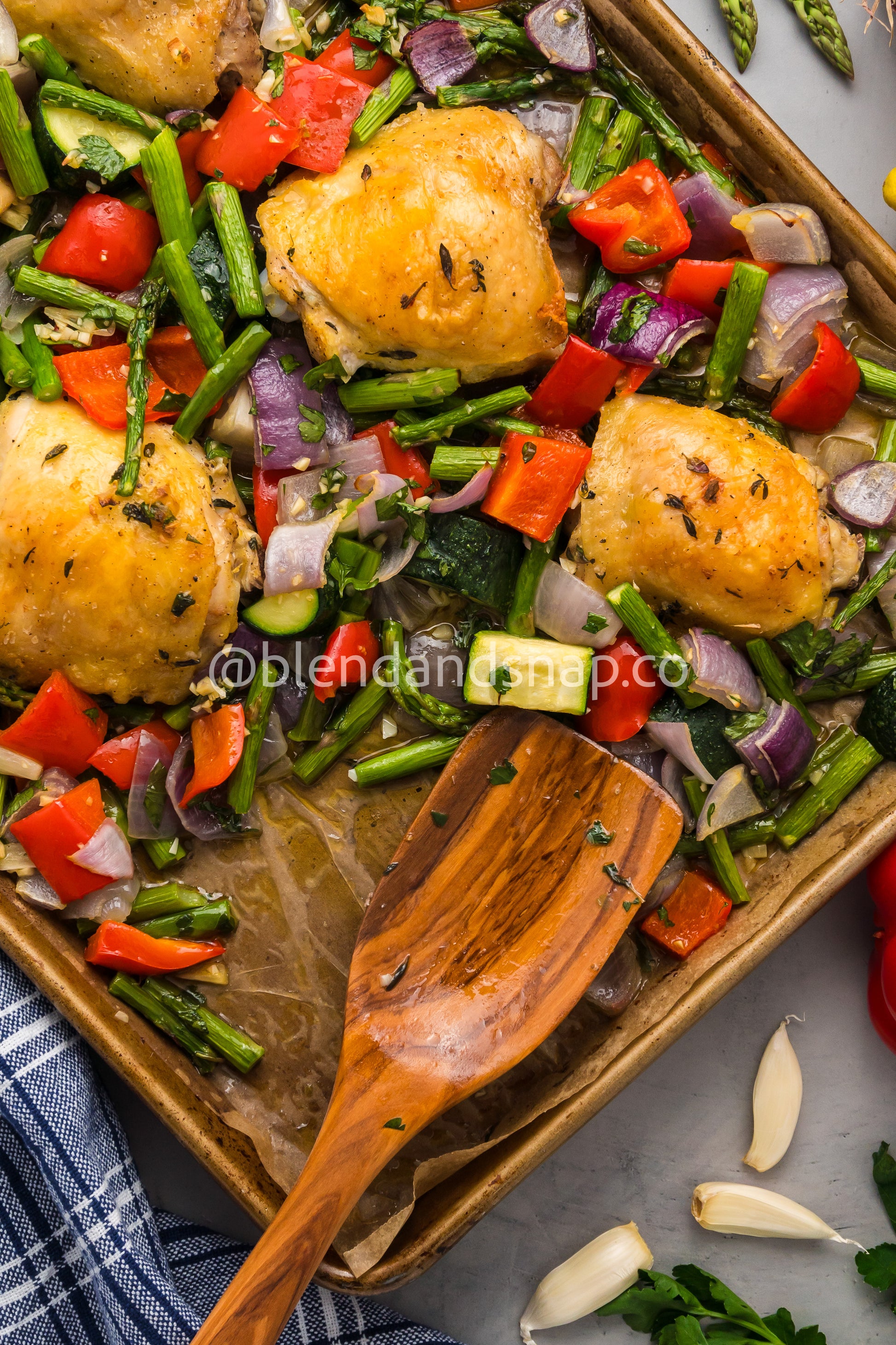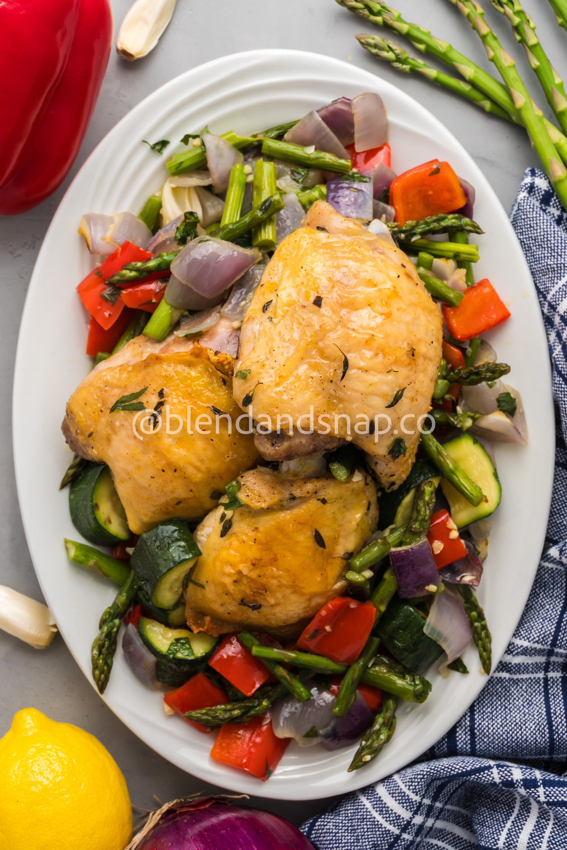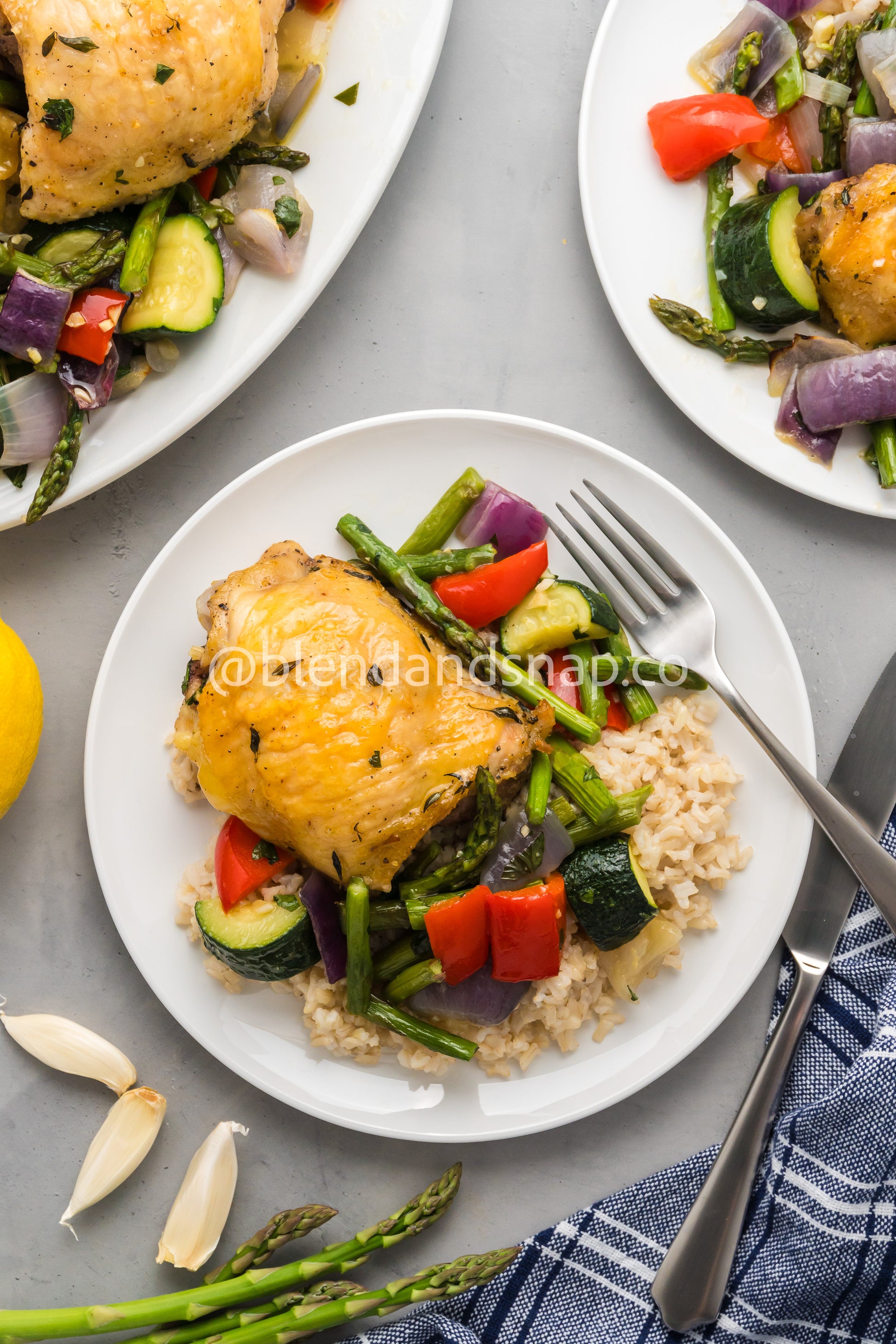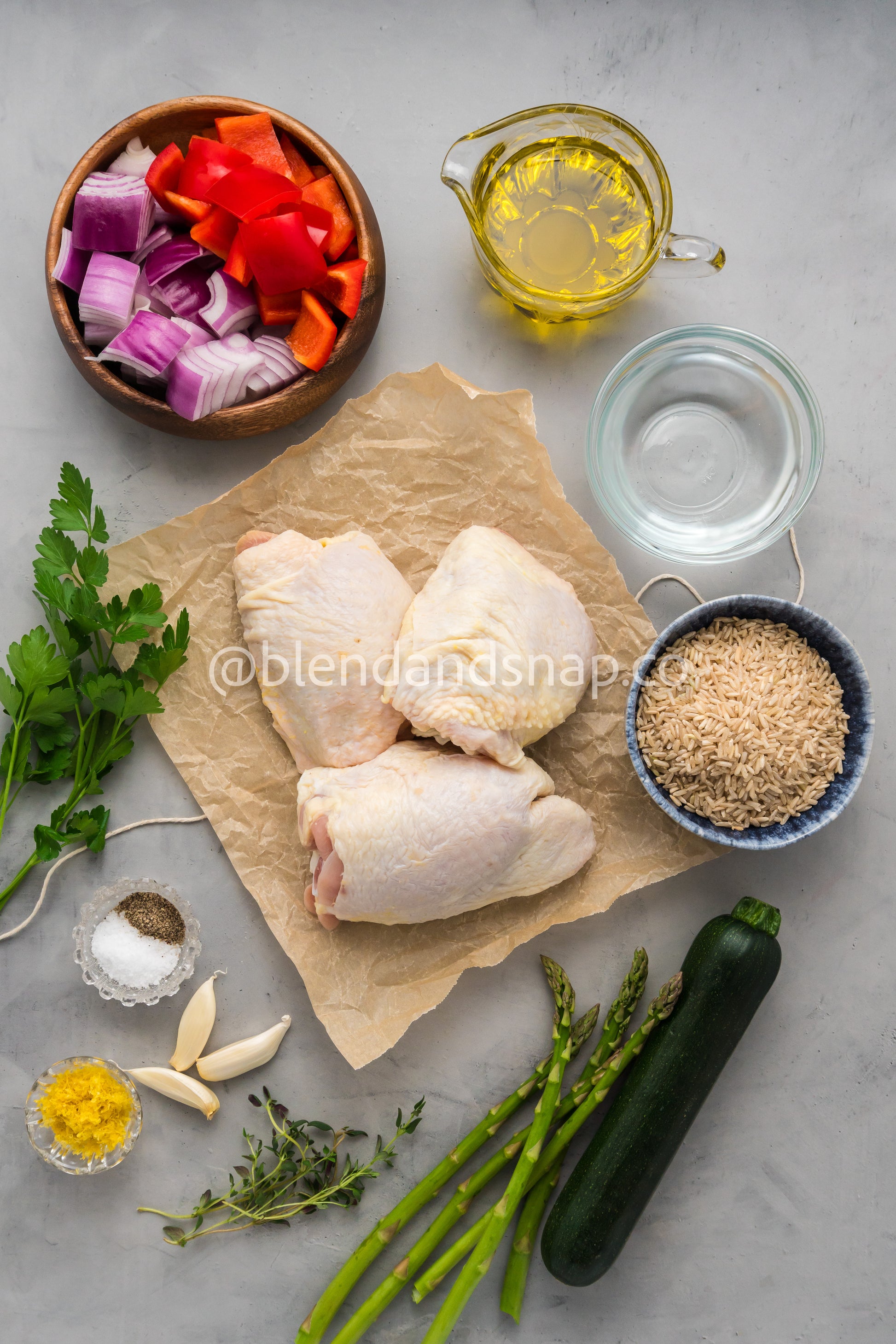 Featured Ingredients: Chicken Thighs, Red Onion, Red Bell Pepper, Asparagus, Lemon Zest, Fresh Thyme, Fresh Parsley, Garlic, Brown Rice