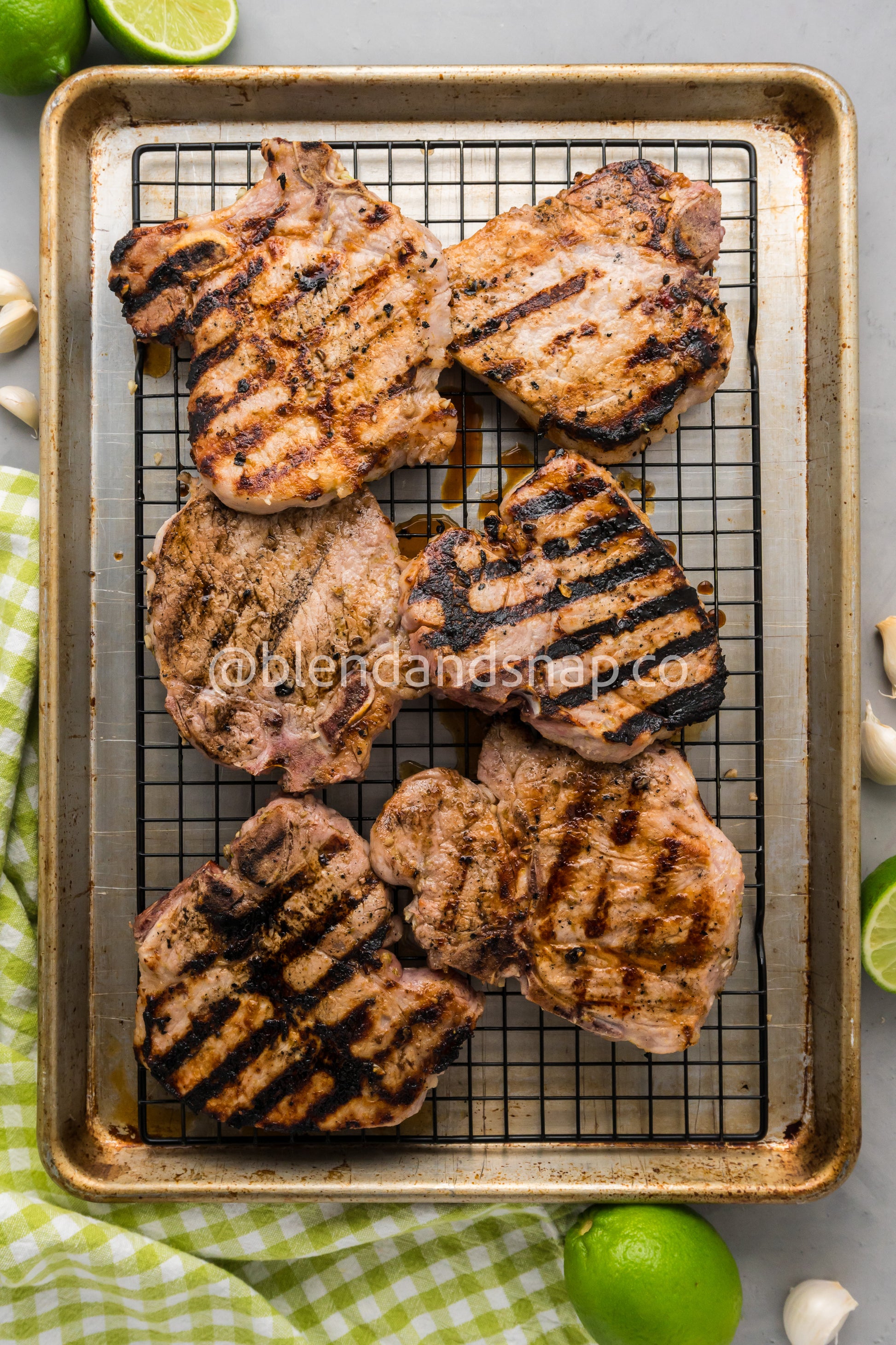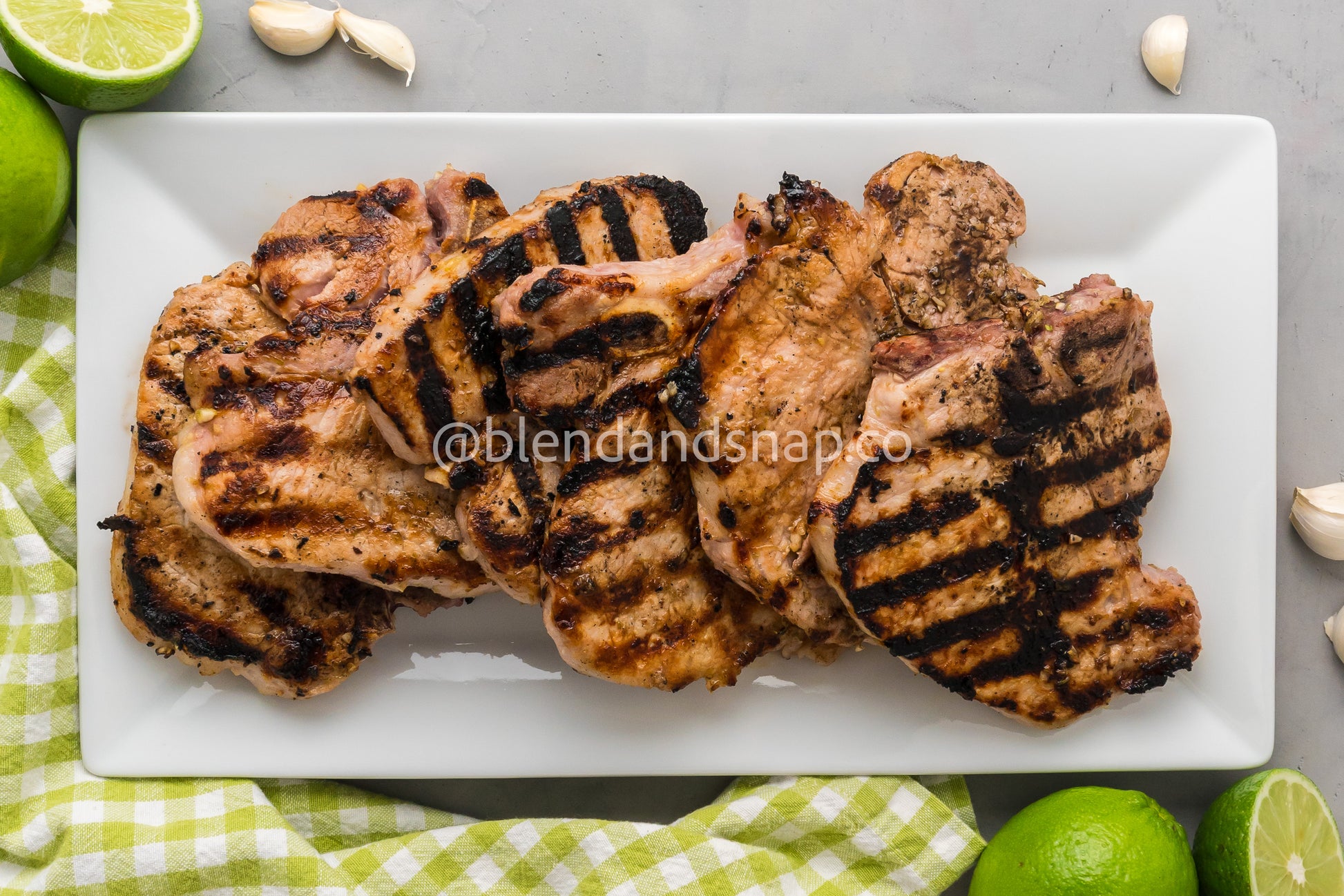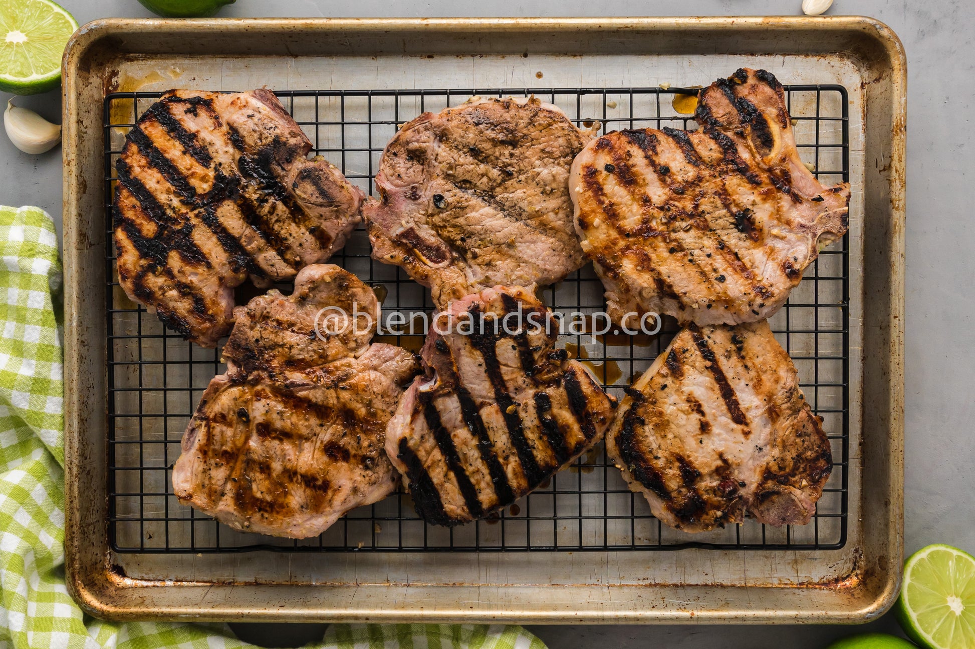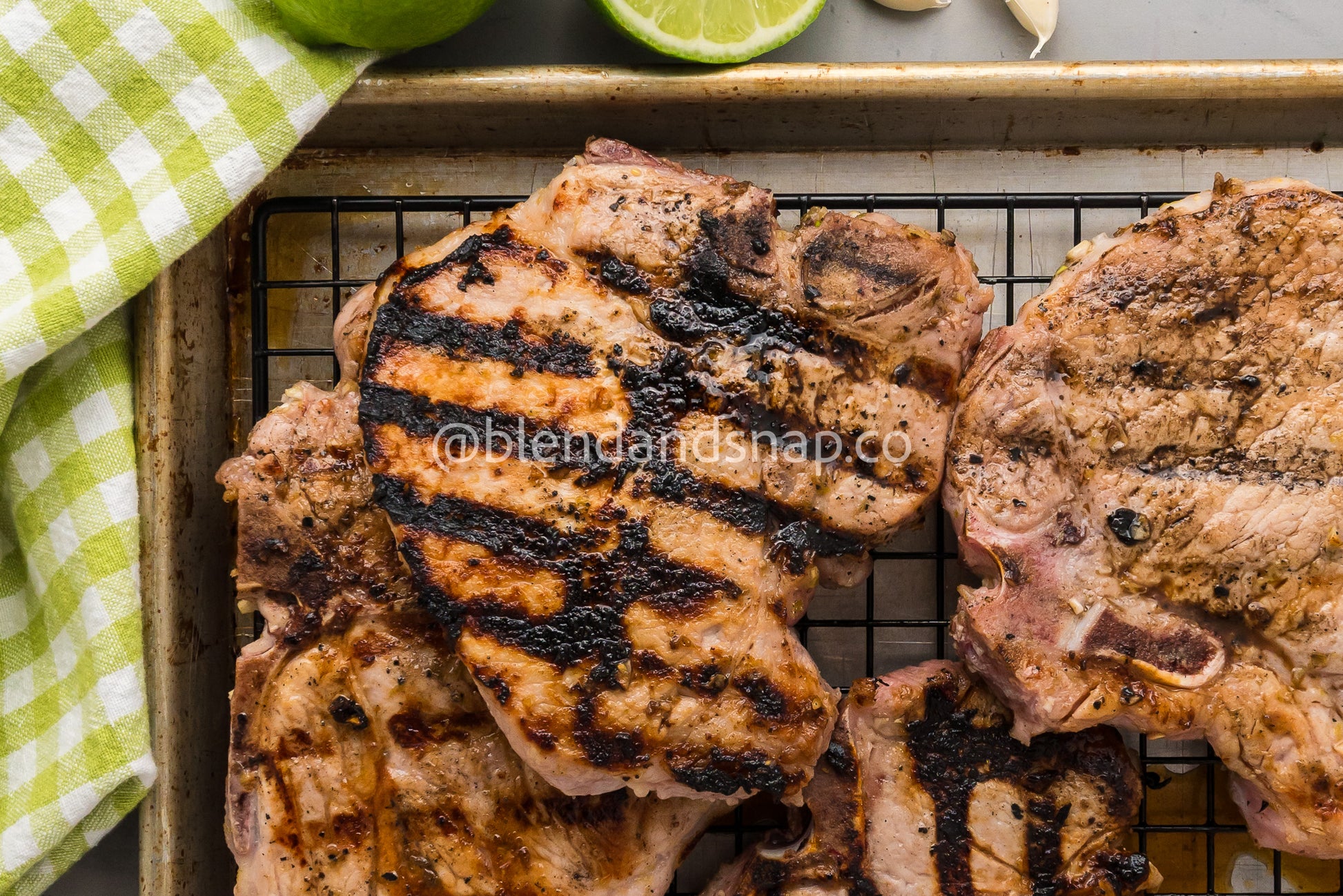 Featured Ingredients for Grilled Pork Chops with Mango Salsa: Bone-in Pork Chops, Lime Juice, Lime Zest, Garlic, Honey, Mango Habanero Salsa