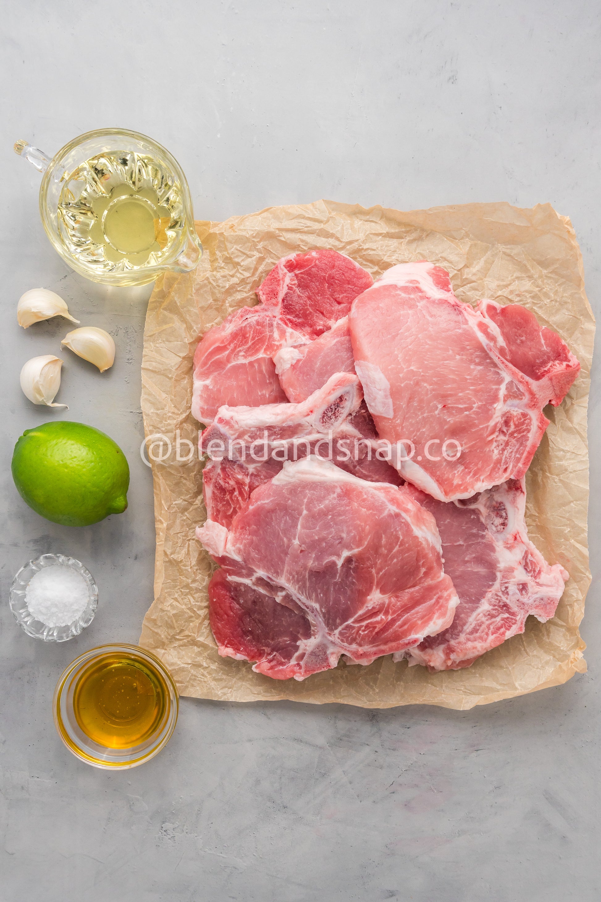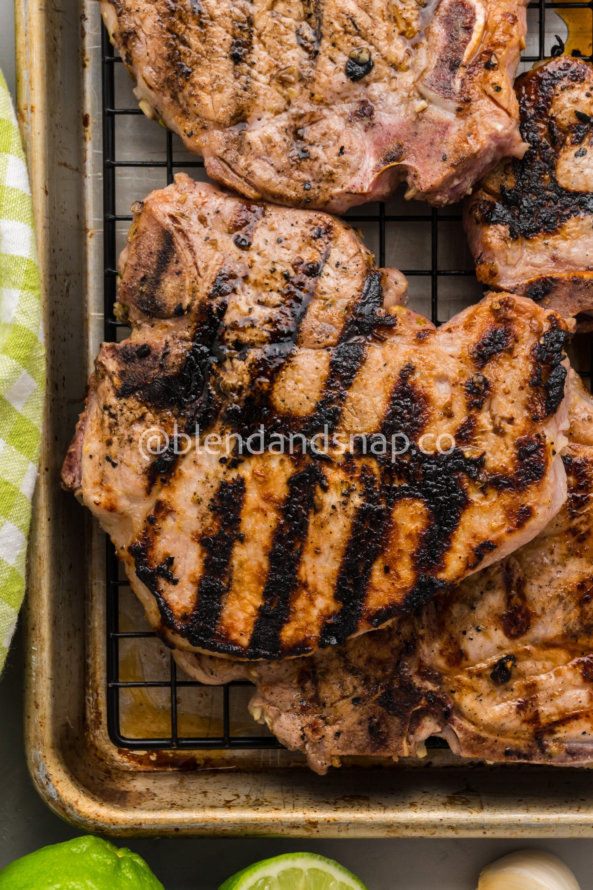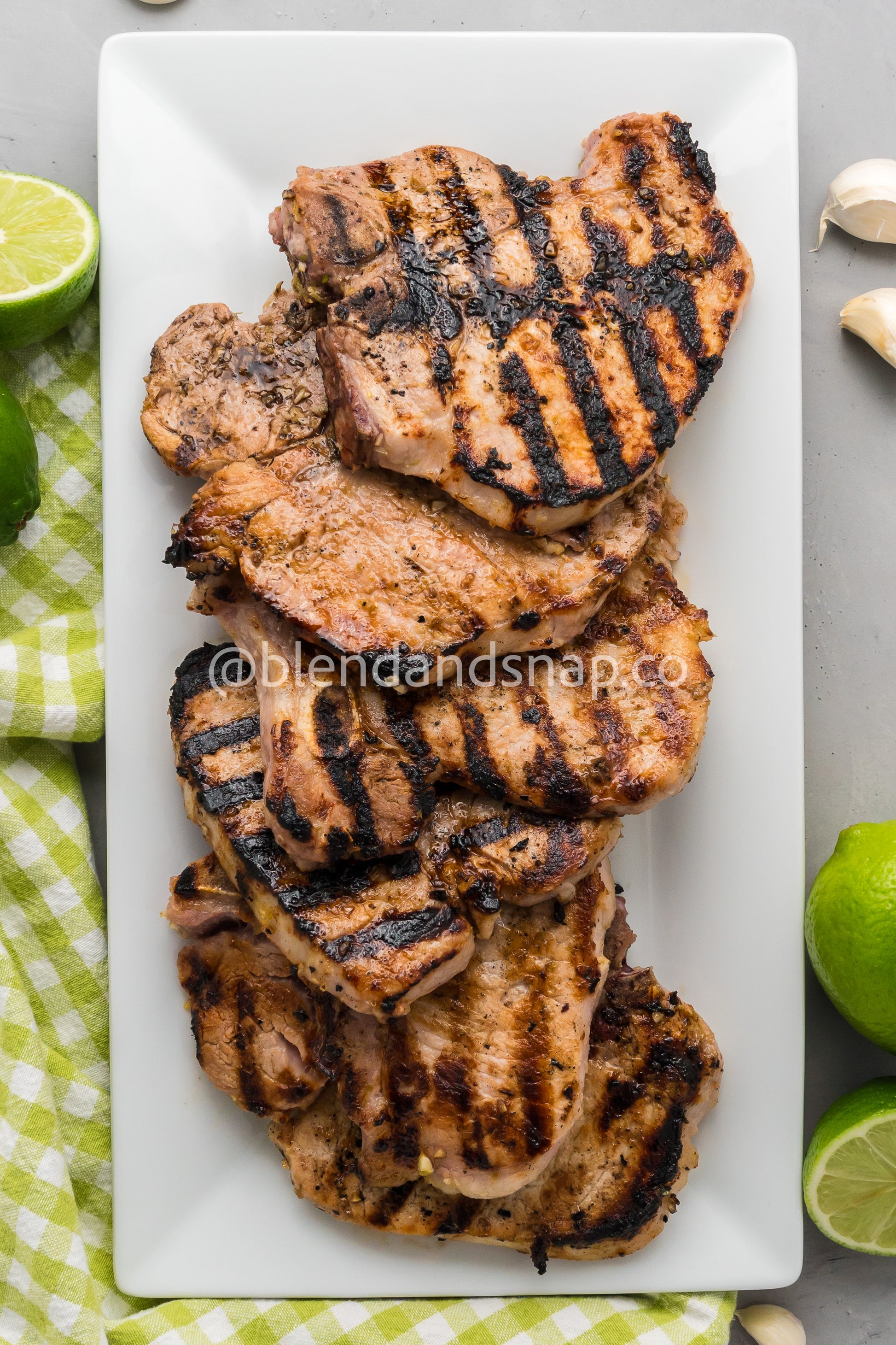 Featured Ingredients for Grilled Pork Chops with Mango Salsa: Bone-in Pork Chops, Lime Juice, Lime Zest, Garlic, Honey, Mango Habanero Salsa