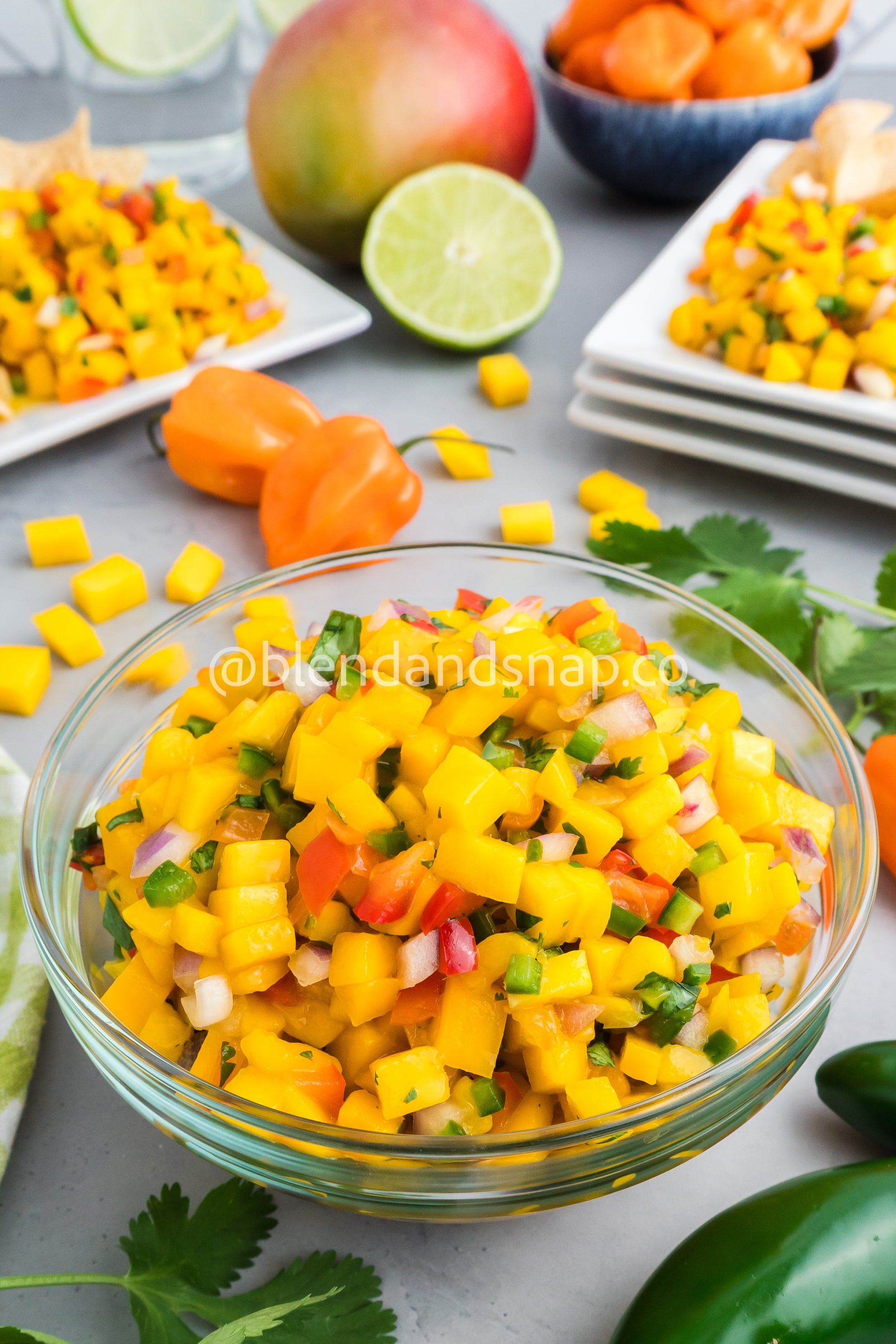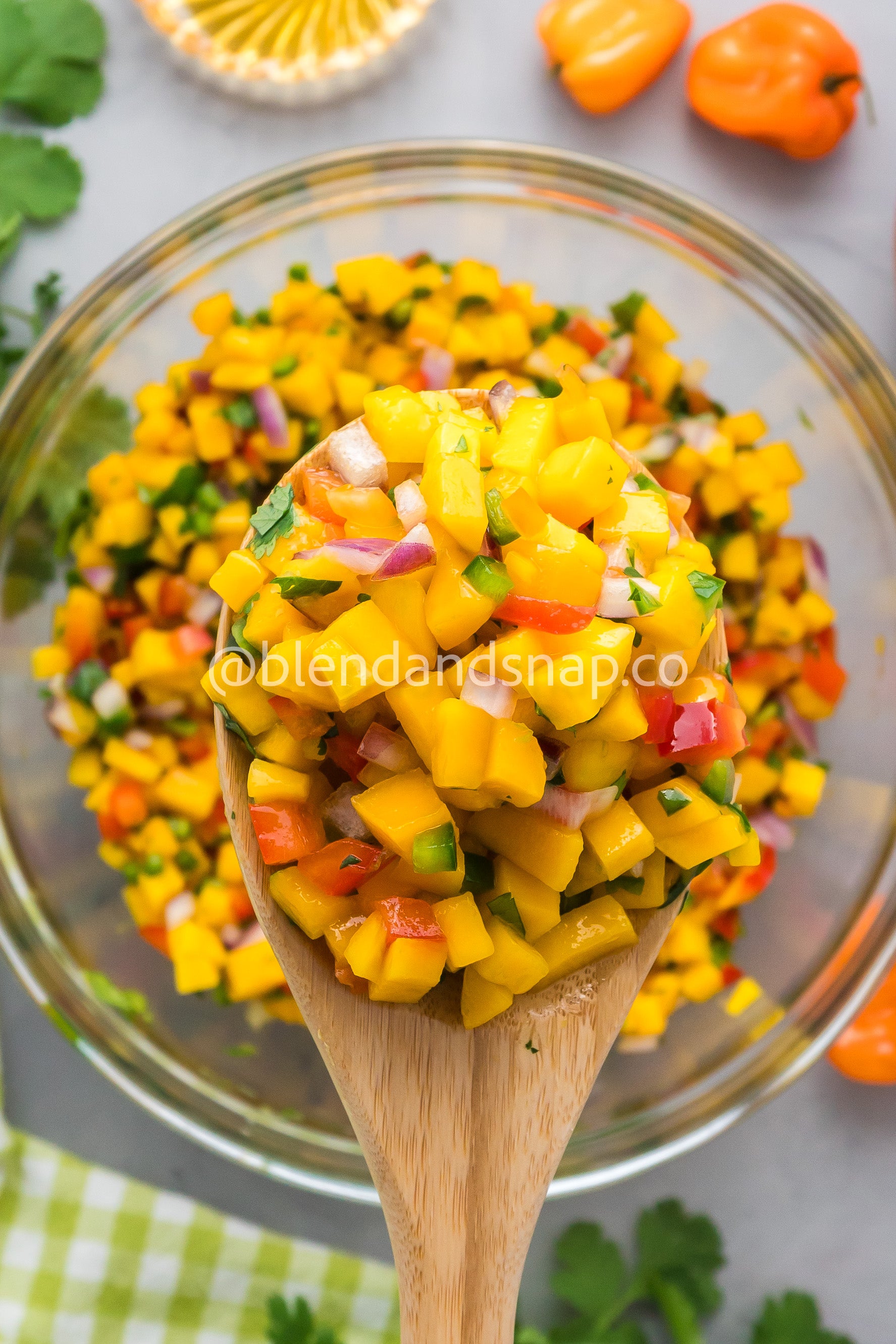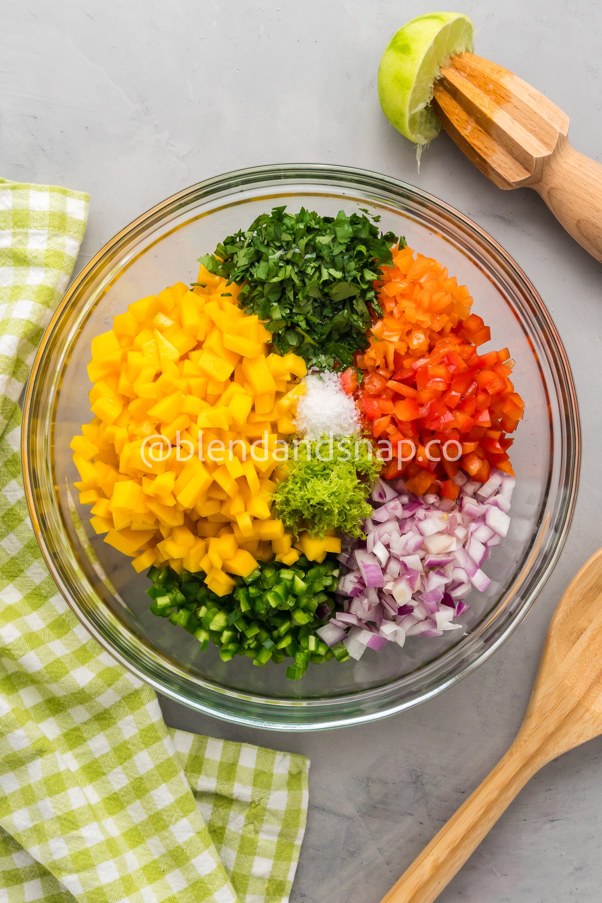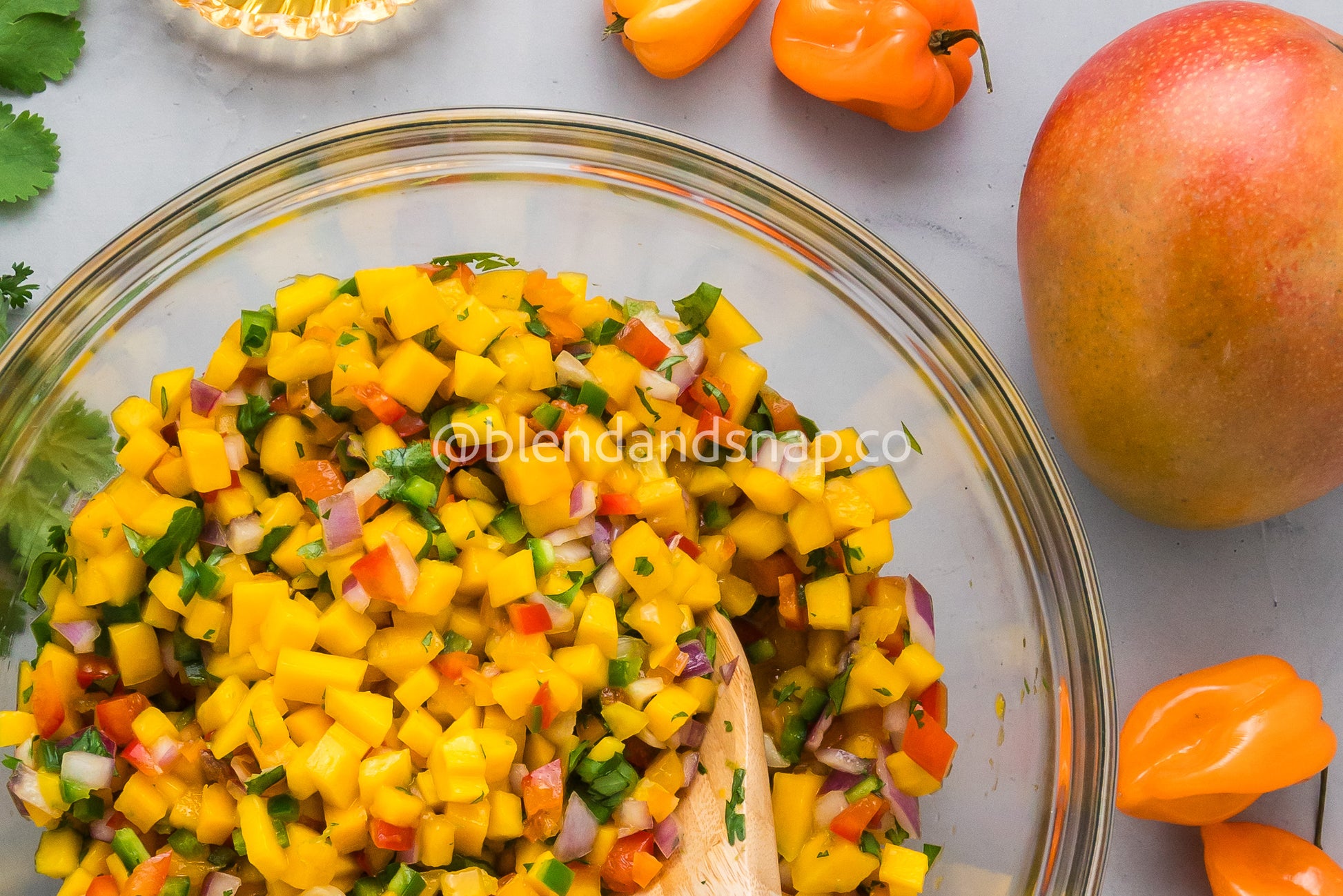 Featured Ingredients for Mango Habanero Salsa: Fresh Mangoes, Red Bell Pepper, Red Onion, Jalapeno Peppers, Habanero Peppers, Honey, Cilantro, Lime Zest, Lime Juice